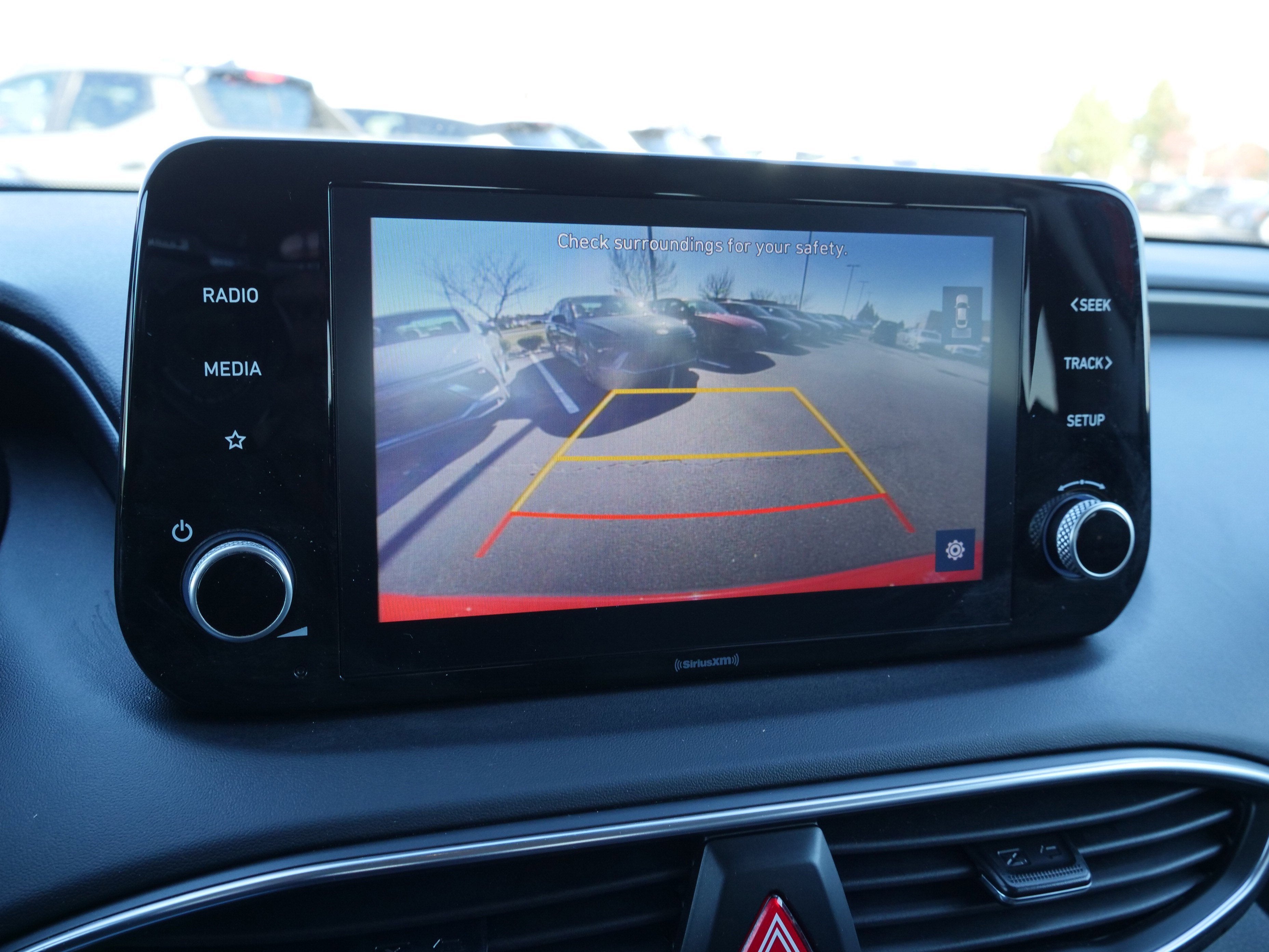 Calypso Red 2022 Hyundai Santa Fe SEL Option Group 01, AWD, Black Cloth, 18 x 7.5J Alloy Wheels, 4-Wheel Disc Brakes, 6 Speakers, ABS brakes, Air Conditioning, Alloy wheels, AM/FM radio: SiriusXM, Apple CarPlay & Android Auto, Auto High-beam Headlights, Axle Ratio: 4.081, Brake assist, Bumpers: body-color, Cargo Net, Cargo Tray, Carpeted Floor Mats, Delay-off headlights, Driver door bin, Driver vanity mirror, Dual front impact airbags, Dual front side impact airbags, Electronic Stability Control, Emergency communication system, Exterior Parking Camera Rear, Four wheel independent suspension, Front anti-roll bar, Front Bucket Seats, Front Center Armrest, Front reading lights, Fully automatic headlights, Heated door mirrors, Heated Front Bucket Seats, Heated front seats, Illuminated entry, Low tire pressure warning, Mudguards, Occupant sensing airbag, Outside temperature display, Overhead airbag, Overhead console, Panic alarm, Passenger door bin, Passenger vanity mirror, Power door mirrors, Power driver seat, Power steering, Power windows, Radio: AM/FM Display Audio, Rear anti-roll bar, Rear seat center armrest, Rear window defroster, Rear window wiper, Remote keyless entry, Roof Rack Cross Bars, Security system, Speed control, Speed-sensing steering, Split folding rear seat, Spoiler, Steering wheel mounted audio controls, Tachometer, Telescoping steering wheel, Tilt steering wheel, Traction control, Trip computer, Variably intermittent wipers, and YES Essentials Stain-Resistant Cloth Seat Trim.