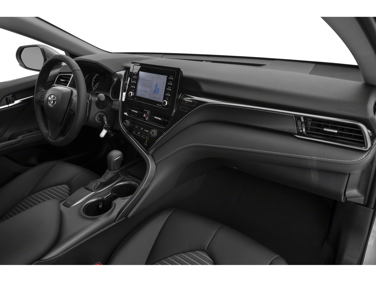 Black 2022 Toyota Camry SE Black Cloth, 4-Wheel Disc Brakes, 6 Speakers, ABS brakes, Air Conditioning, Alloy wheels, AM/FM radio: SiriusXM, Apple CarPlay/Android Auto, Auto High-beam Headlights, Automatic temperature control, Brake assist, Bumpers: body-color, Delay-off headlights, Driver door bin, Driver vanity mirror, Dual front impact airbags, Dual front side impact airbags, Electronic Stability Control, Emergency communication system: Safety Connect with 1-year trial, Exterior Parking Camera Rear, Fabric Seat Trim w/Sport SofTex, Four wheel independent suspension, Front anti-roll bar, Front Bucket Seats, Front Center Armrest, Front dual zone A/C, Front reading lights, Fully automatic headlights, Heated door mirrors, Illuminated entry, Knee airbag, Low tire pressure warning, Occupant sensing airbag, Outside temperature display, Overhead airbag, Overhead console, Panic alarm, Passenger door bin, Passenger vanity mirror, Power door mirrors, Power driver seat, Power steering, Power windows, Radio data system, Radio: AM/FM Audio System, Rear anti-roll bar, Rear seat center armrest, Rear side impact airbag, Rear window defroster, Remote keyless entry, Security system, Speed control, Speed-sensing steering, Split folding rear seat, Spoiler, Steering wheel mounted audio controls, Tachometer, Telescoping steering wheel, Tilt steering wheel, Traction control, Trip computer, Turn signal indicator mirrors, Variably intermittent wipers, and Wheels: 8.0J x 18 Black Machined-Finish Alloy.28/39 City/Highway MPG Odometer is 12671 miles below market average!