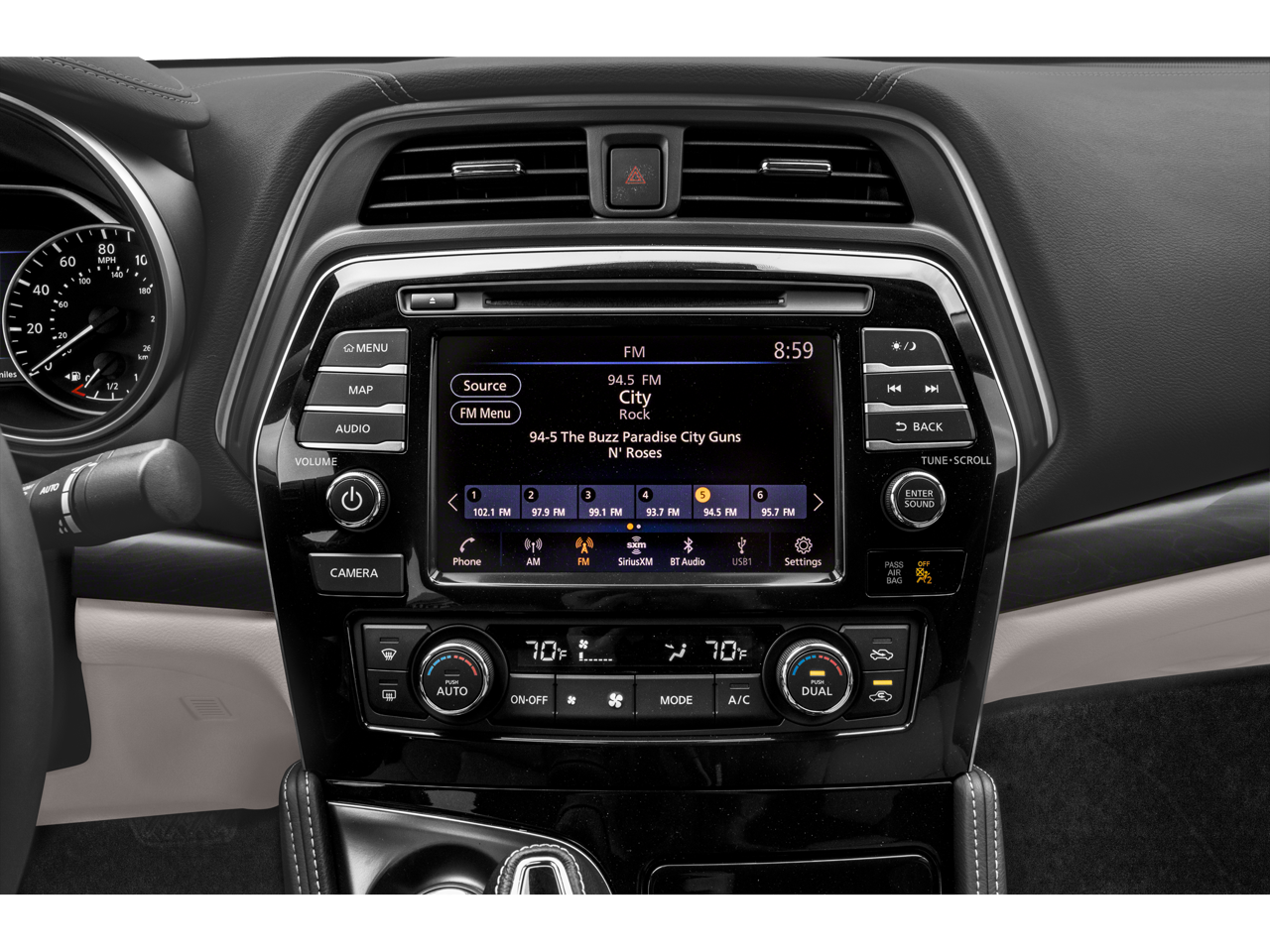- Radio: AM/FM/CD Bose Audio System -inc: MP3/WMA/AUX reader, 11 speakers, NissanConnect featuring 8" color display w/multi-touch control, Apple CarPlay, Android Auto, 2 front illuminated USB connection ports (1 Type-A, 1 Type-C), Bluetooth® hands-free phone system, hands-free text messaging assistant, streaming audio via Bluetooth®, voice recognition, Siri Eyes Free, SiriusXM radio, SiriusXM advanced audio features, NissanConnect services powered by SiriusXM, Wi-Fi hotspot, Nissan door to door navigation, SiriusXM Traffic, SiriusXM Travel Link, display commander and 7" Advanced Drive Assist Display (ADAD)