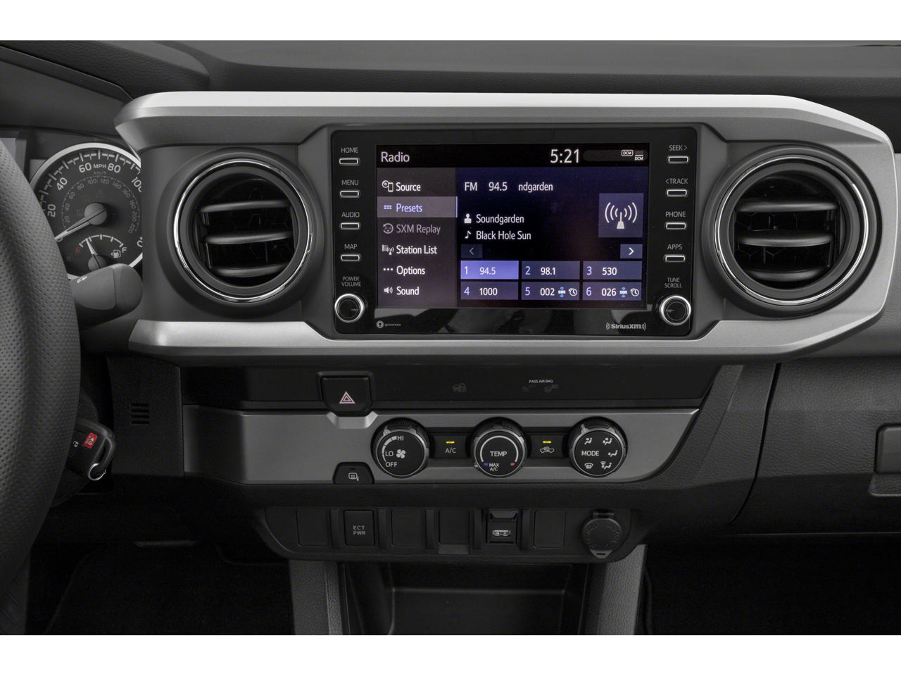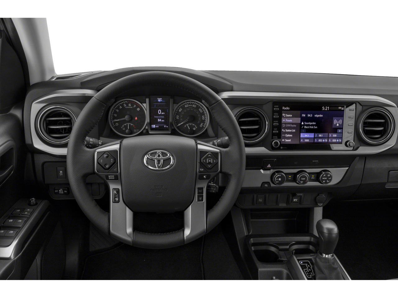 Recent Arrival! Silver 2023 Toyota Tacoma V6 120V/400W Deck Mounted AC Power, 6 Speakers, ABS brakes, Air Conditioning, Alloy wheels, AM/FM radio: SiriusXM, Anti-whiplash front head restraints, Apple CarPlay/Android Auto, Auto High-beam Headlights, Auto-dimming Rear-View mirror, Automatic temperature control, Axle Ratio: 3.91, Brake assist, Bumpers: body-color, Driver door bin, Dual front impact airbags, Dual front side impact airbags, Electronic Stability Control, Emergency communication system: Safety Connect (1-year trial), Engine Immobilizer, Exterior Parking Camera Rear, Fabric Seat Trim, Front anti-roll bar, Front Bucket Seats, Front Center Armrest, Front dual zone A/C, Front fog lights, Front reading lights, Front Seats, Front wheel independent suspension, Heated door mirrors, Illuminated entry, Knee airbag, Leather Seat Trim, Leather Shift Knob, Low tire pressure warning, Occupant sensing airbag, Outside temperature display, Overhead airbag, Overhead console, Panic alarm, Passenger door bin, Power door mirrors, Power driver seat, Power steering, Power windows, Radio: Audio, Rear step bumper, Remote keyless entry, Security system, Speed control, Speed-sensing steering, Split folding rear seat, Steering wheel mounted audio controls, Tachometer, Telescoping steering wheel, Tilt steering wheel, Traction control, Trip computer, Turn signal indicator mirrors, and Variably intermittent wipers.
